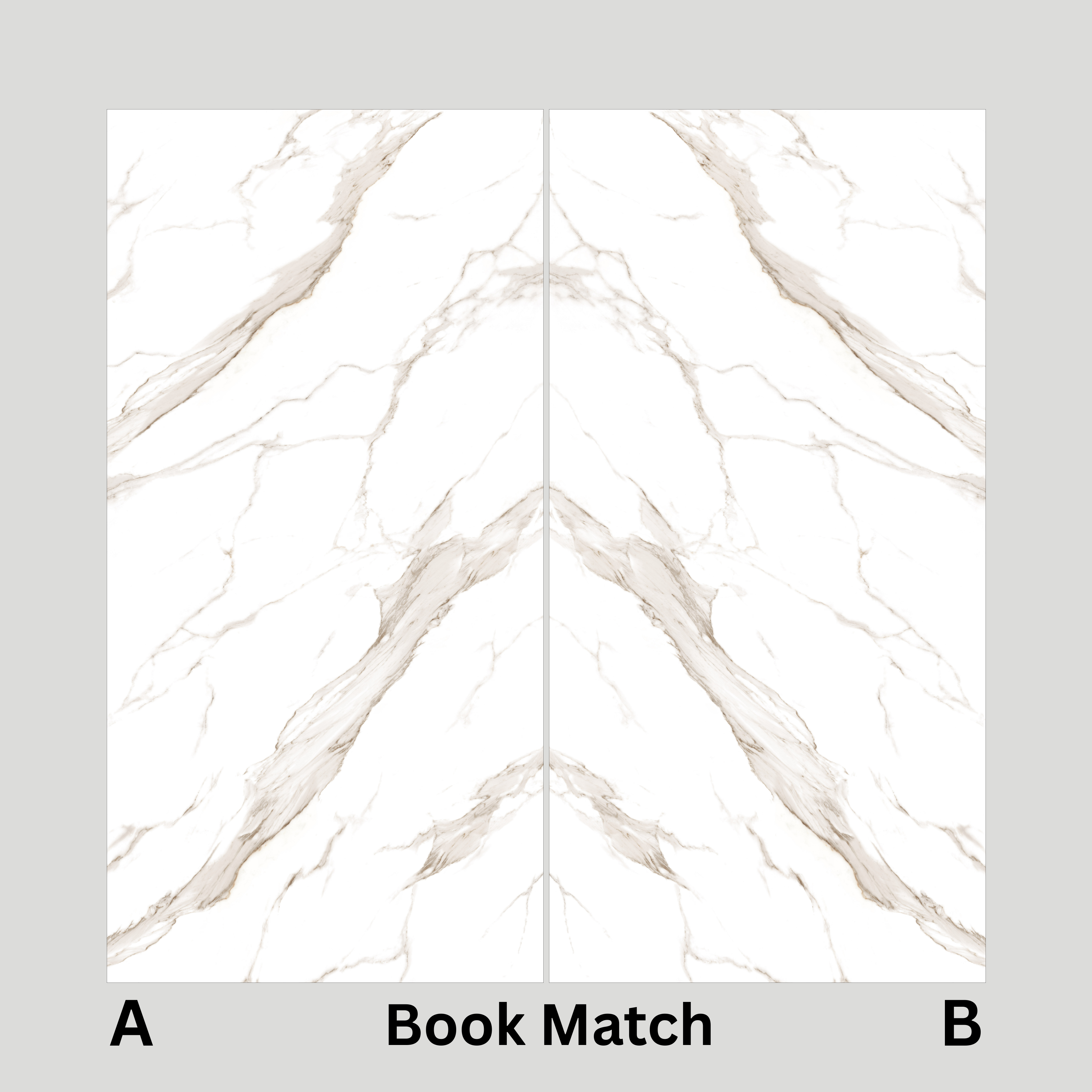 The Calacatta Gold Tile offers timeless elegance with its marble-inspired design and book-match matt finish, perfect for creating a luxurious and sophisticated ambiance. Its large 120x240cm format enables continuous, seamless patterns, giving walls and floors a grand, upscale look. The matt surface provides a soft, non-reflective texture that highlights the natural veining and tones of marble while reducing glare.