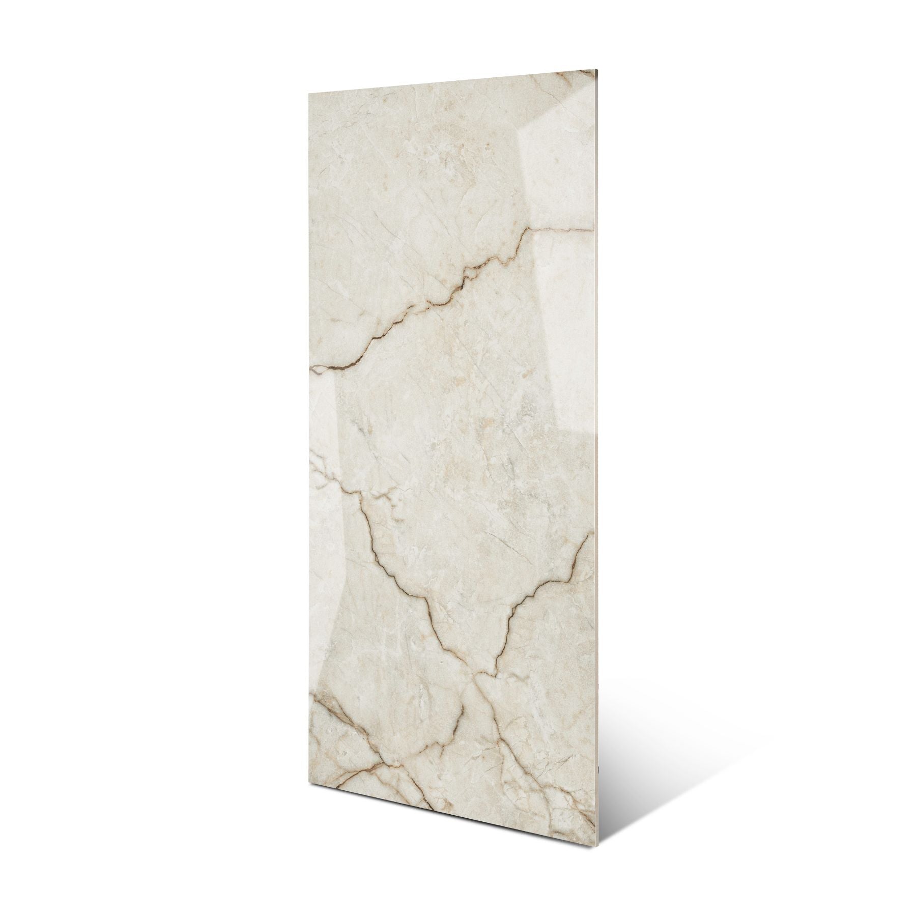 xA glossy white and gold marble-look porcelain tile in 60x120cm size with 9mm thickness, ideal for luxury residential and commercial interiors.